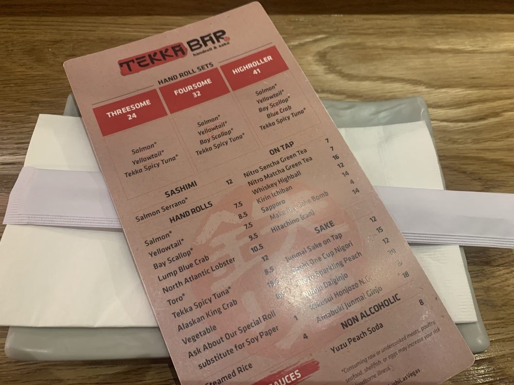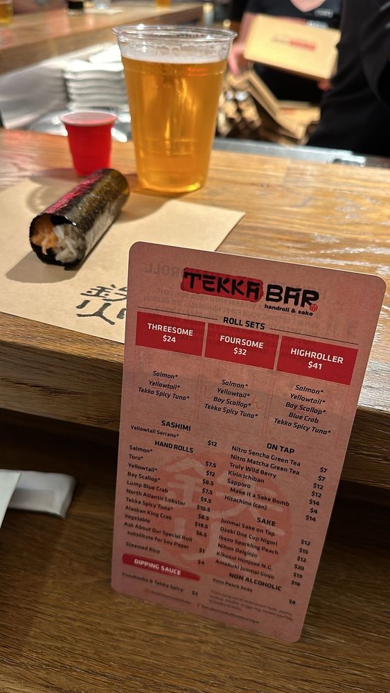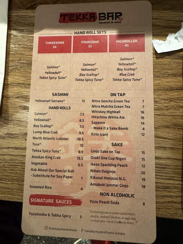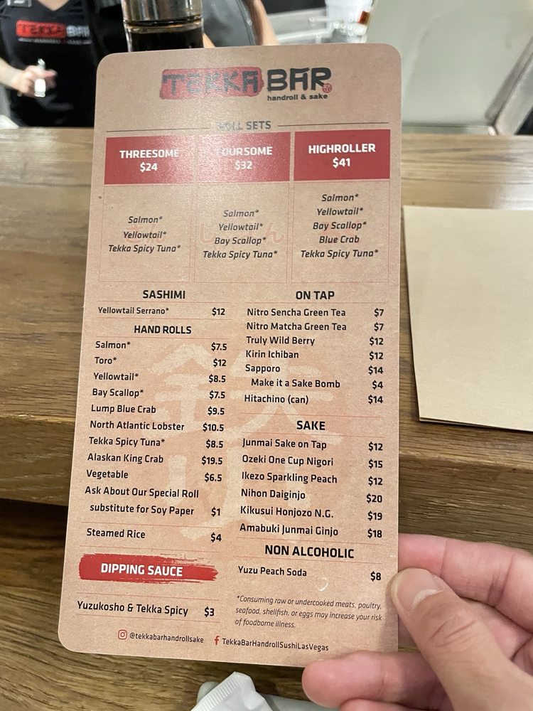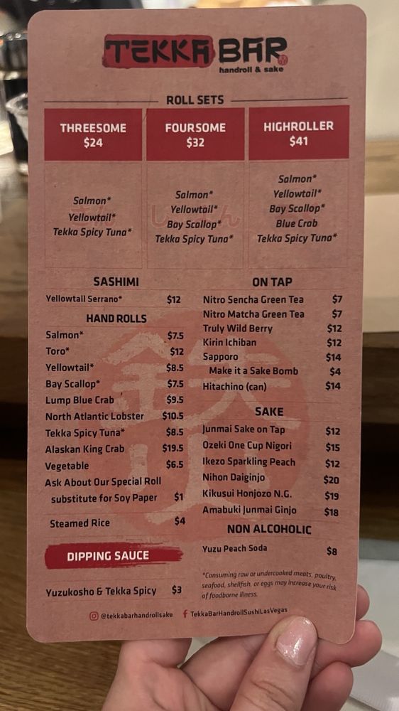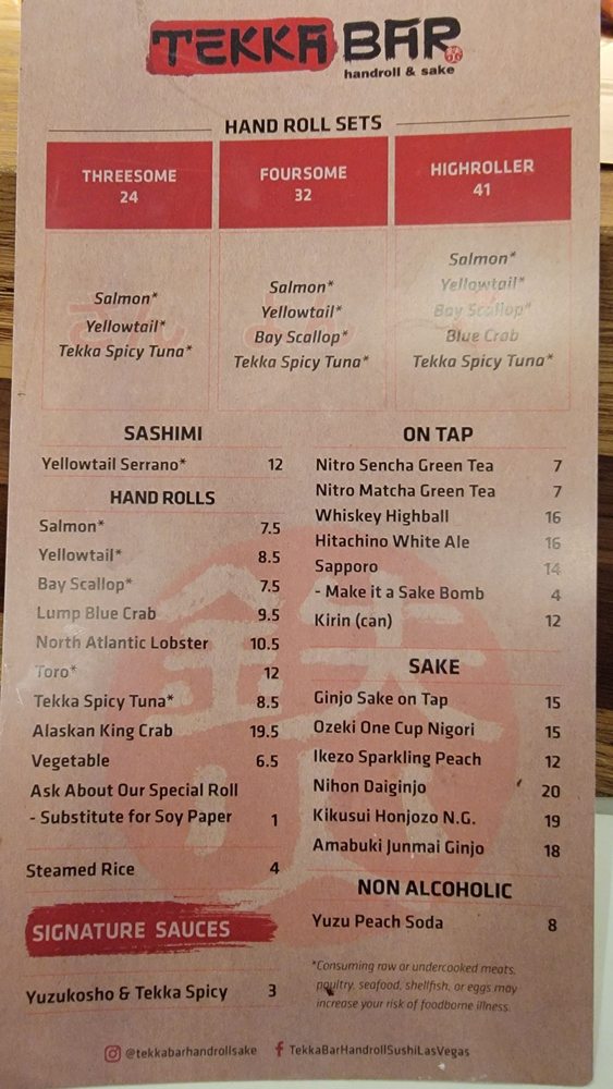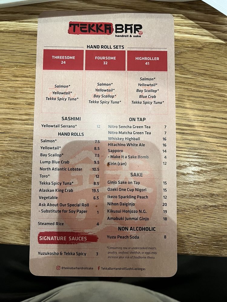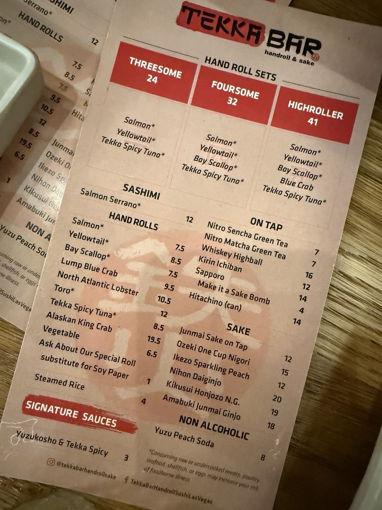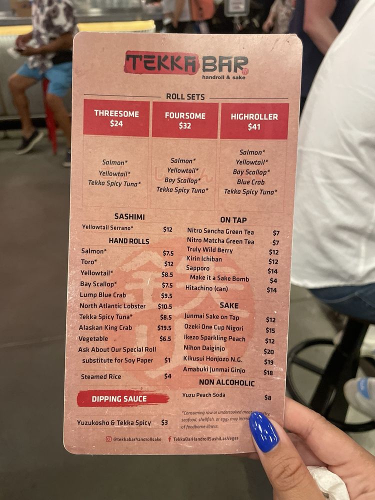 Welcome to Tekka Bar: Handroll & Sake, a hidden gem nestled in the heart of the Cosmopolitan of Las Vegas. This trendy spot offers a unique dining experience focused on freshly crafted handrolls, perfect for quick lunches or late-night bites. The menu features an array of gourmet handrolls made to order, with standout options like the spicy tuna—a delightful textural contrast of crunchy seaweed around warm, fluffy rice.